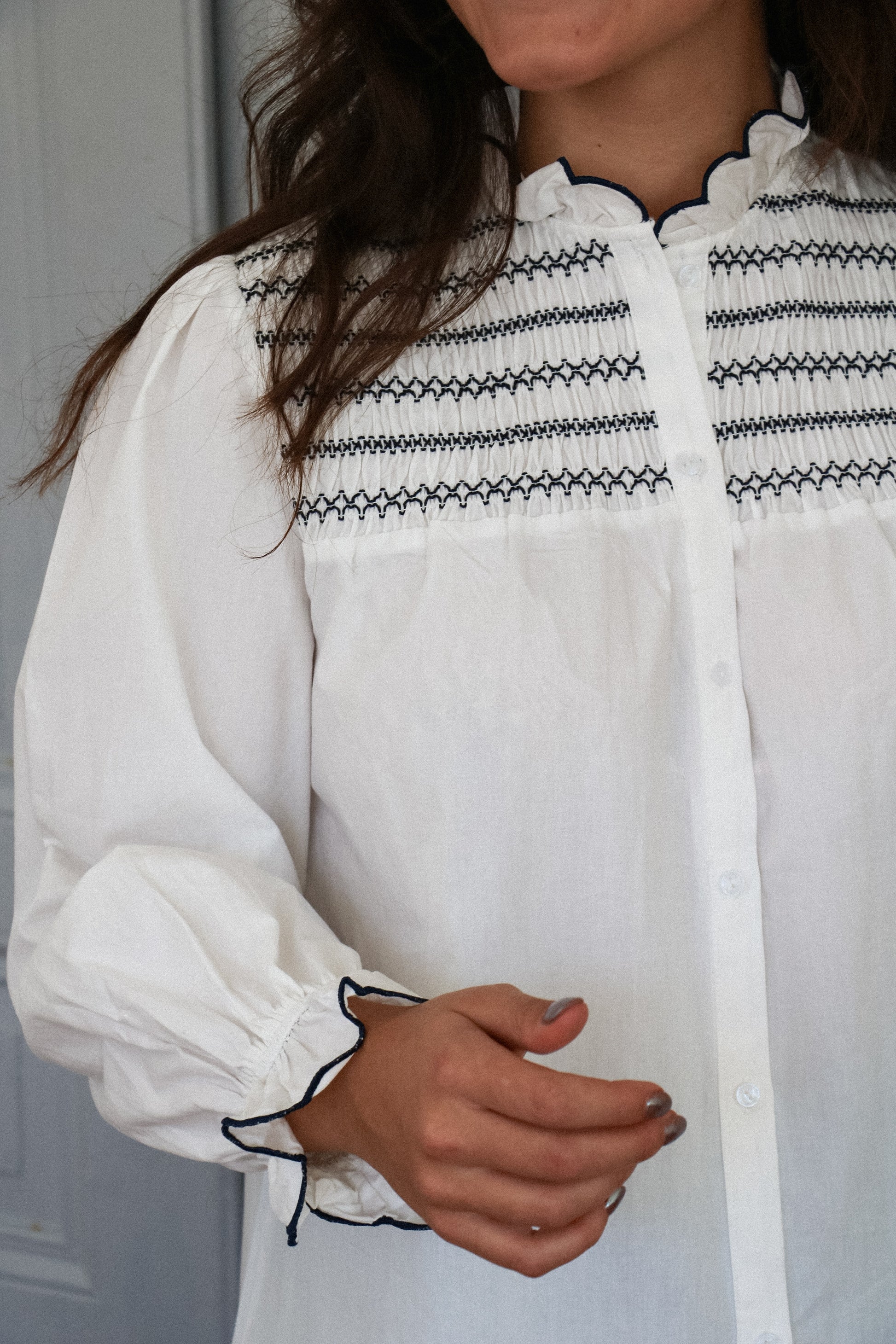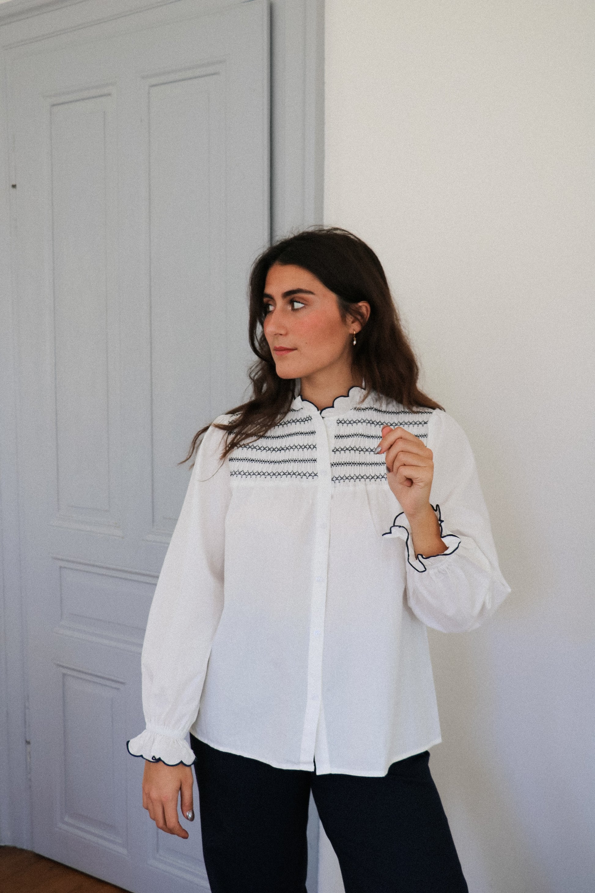 Esmée est la blouse qui mélange l'esprit bohème et l'élégance intemporelle. Ses détails smockés et son col délicatement volanté apportent une touche romantique.