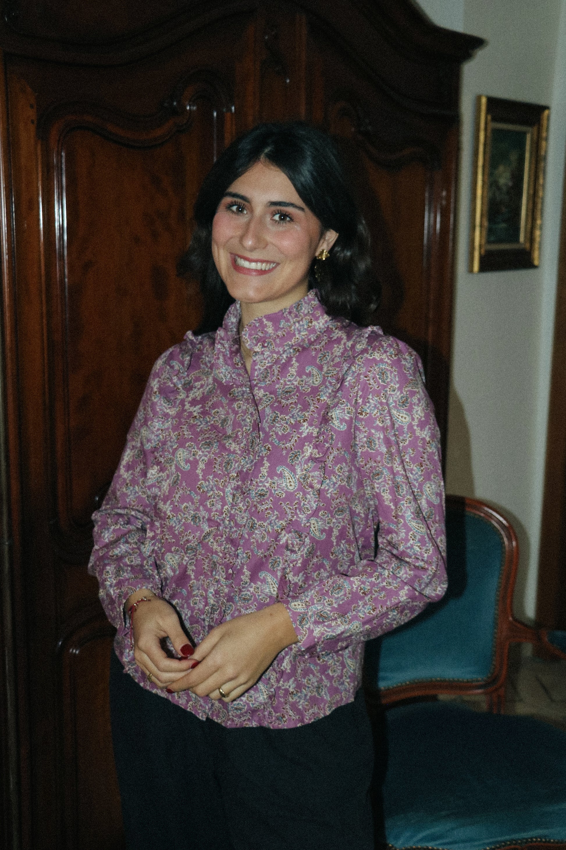 Blouse légère aux teintes florales, ornée d'un col volante qui danse avec chaque mouvement. Cette pièce mauve et fleurie apporte une touche de poésie à vos tenues du quotidien.