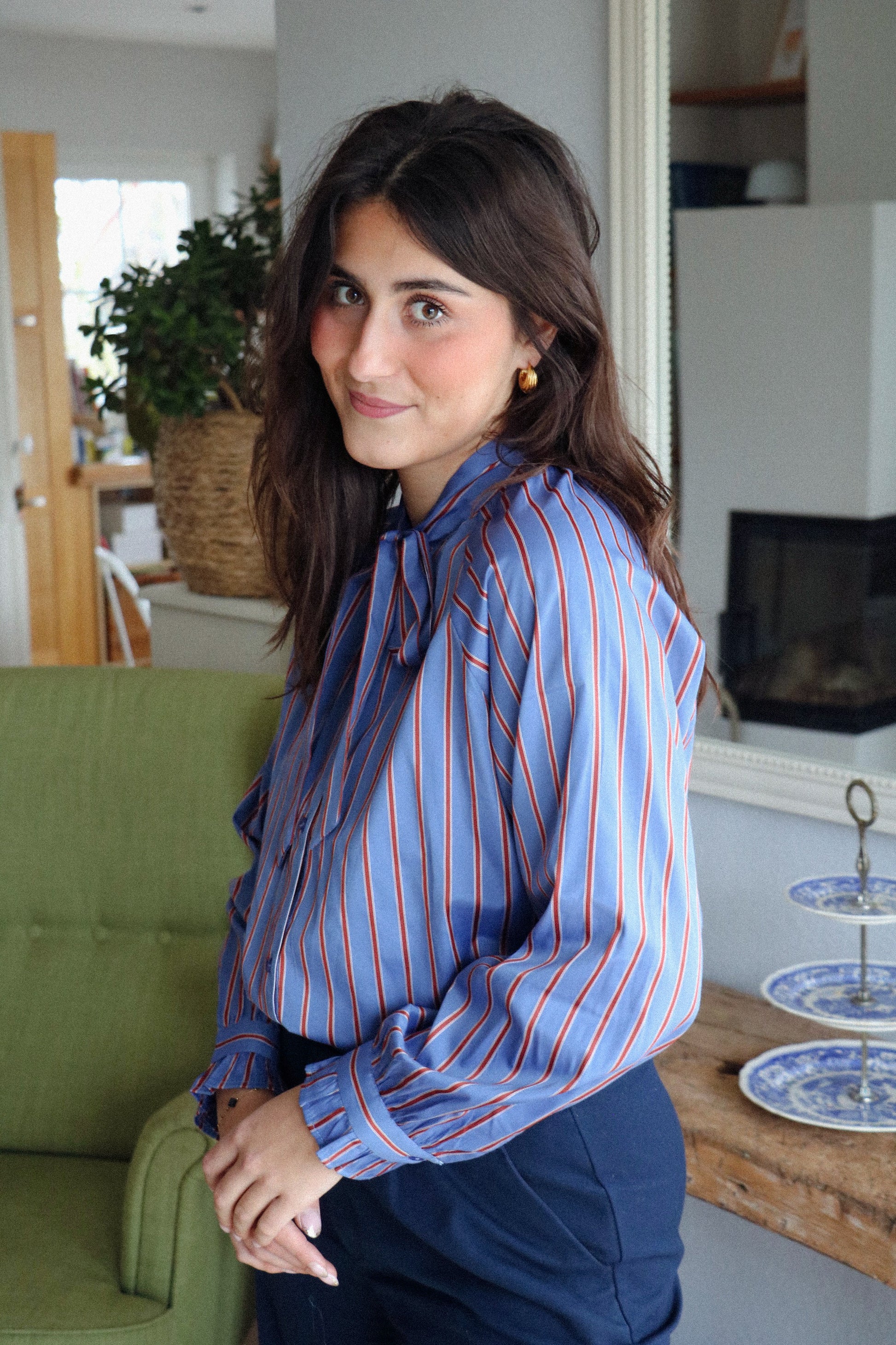 Blouse bleu et rouge fluide. Lucie, chic avec son nœud est une pièce unique et tendance. Cette blouse est parfaite pour la fin de l'hiver.
