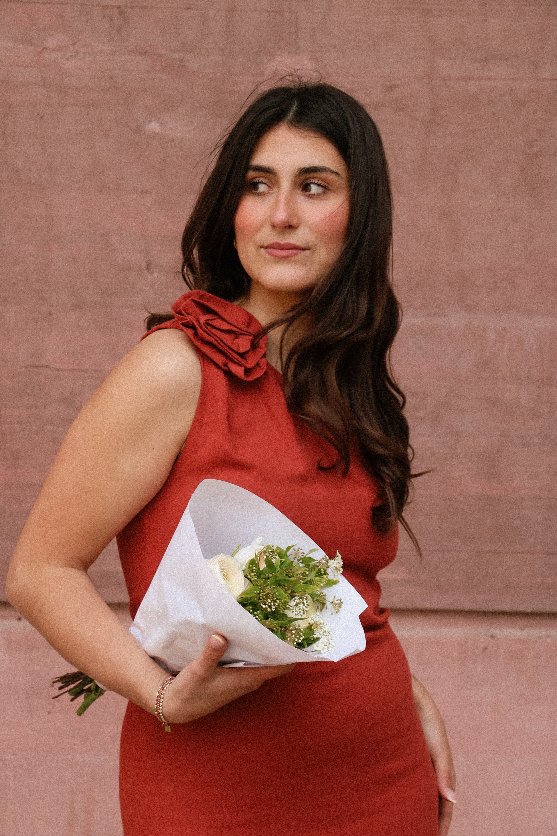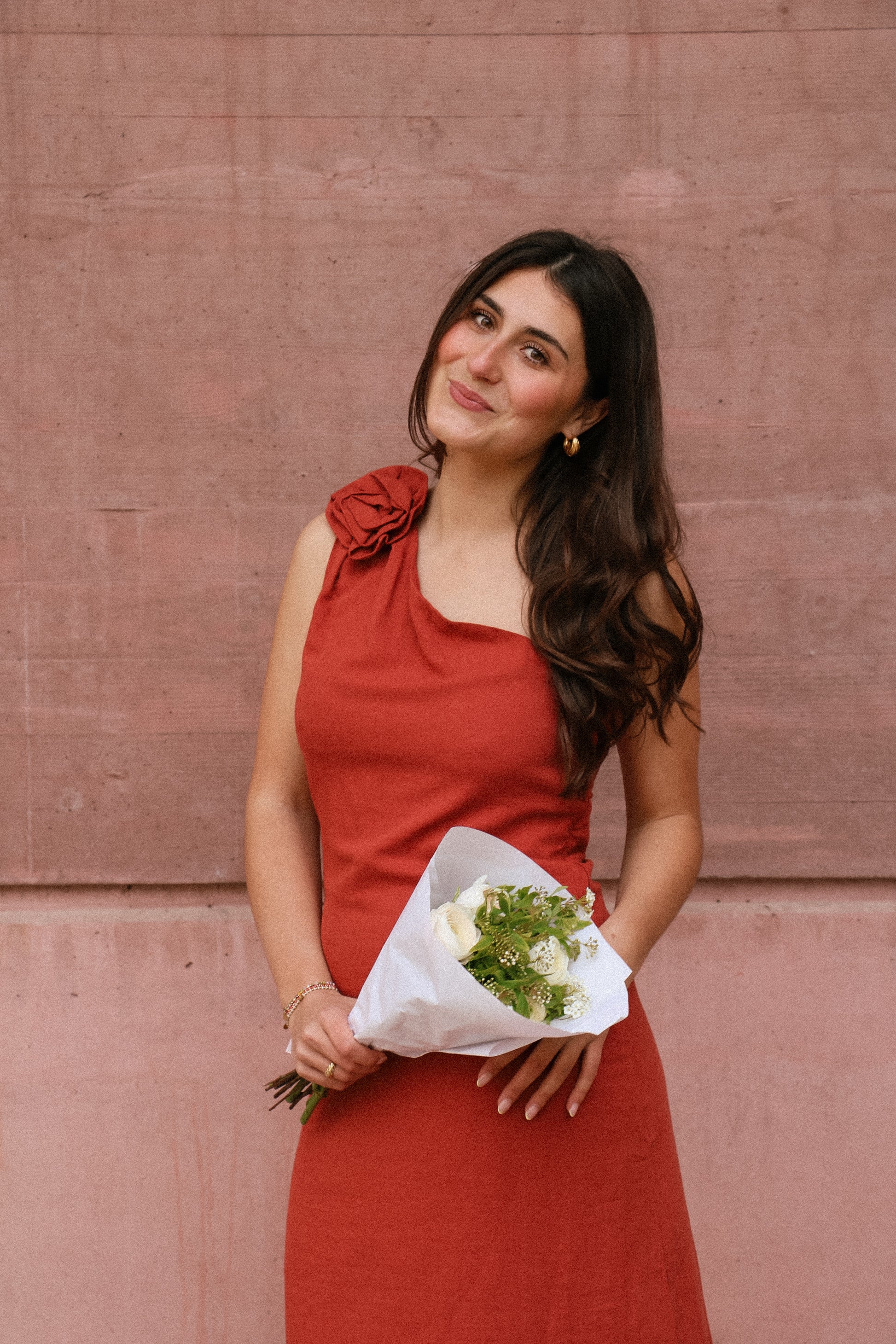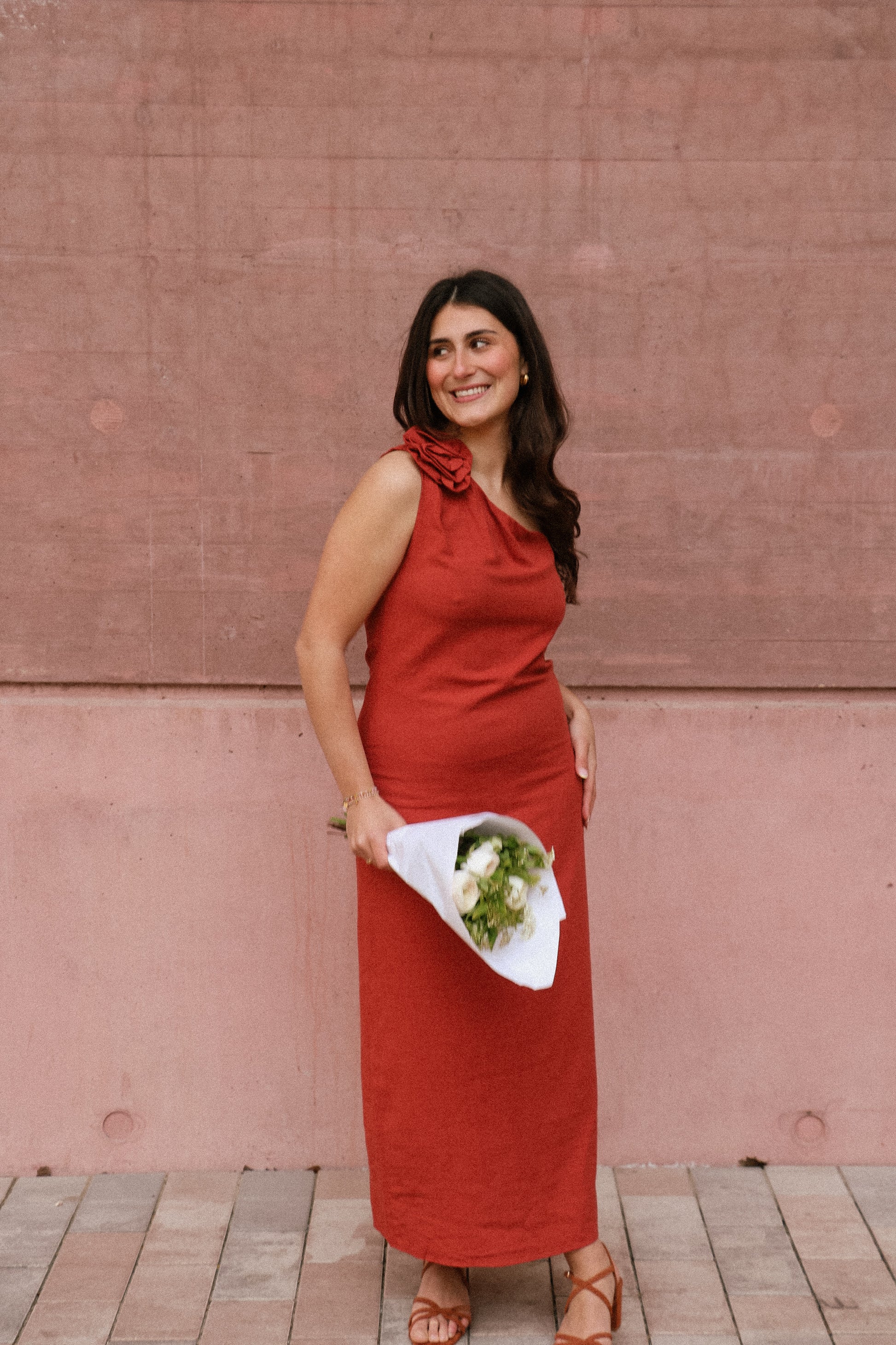 Robe longue terracotta ocre à bretelles asymétriques, alliant élégance et originalité. Sa coupe structurée et légèrement ajustée sublime la silhouette tout en offrant un bon maintien. La bretelle, ornée d’une fleur apporte une touche délicate et féminine, idéale pour vos cocktails et occasions spéciales.