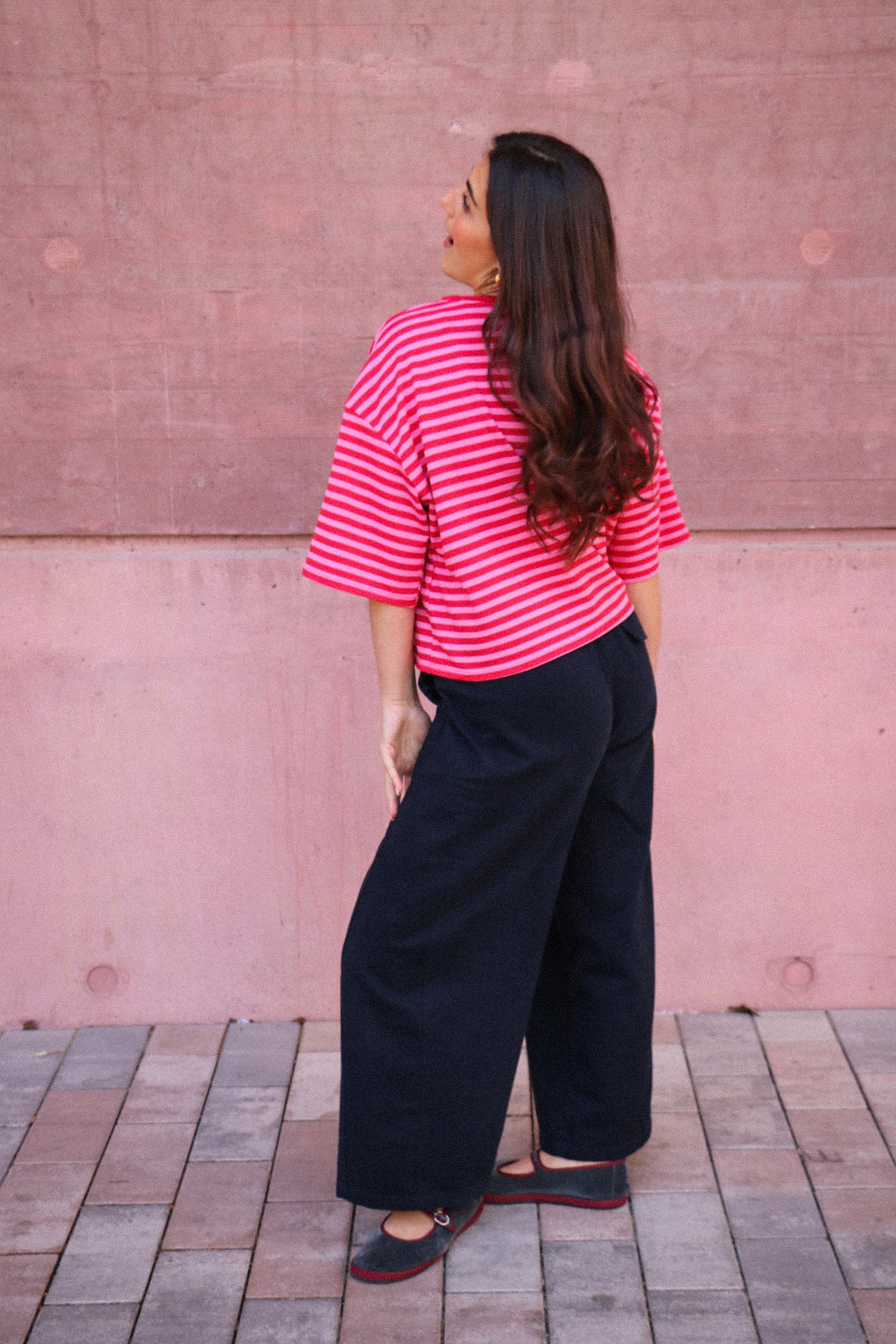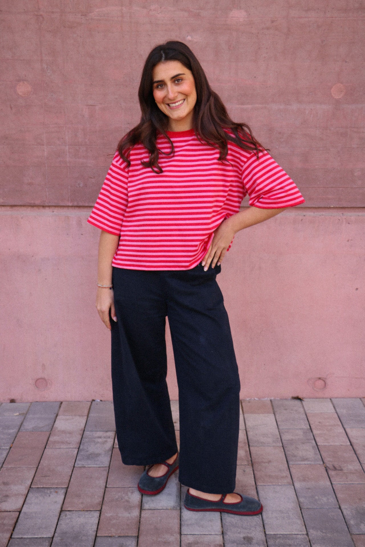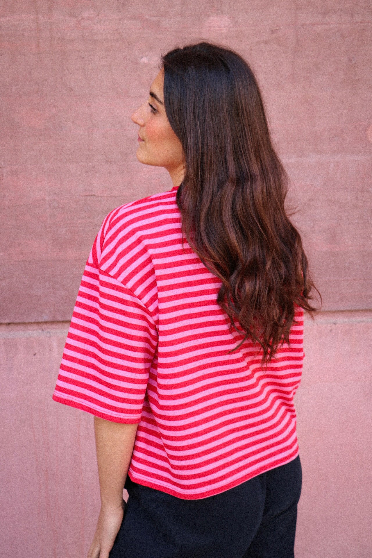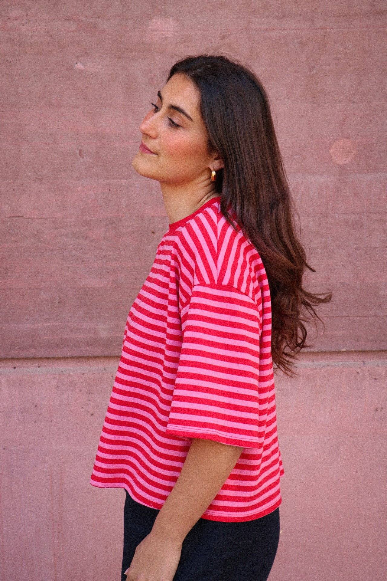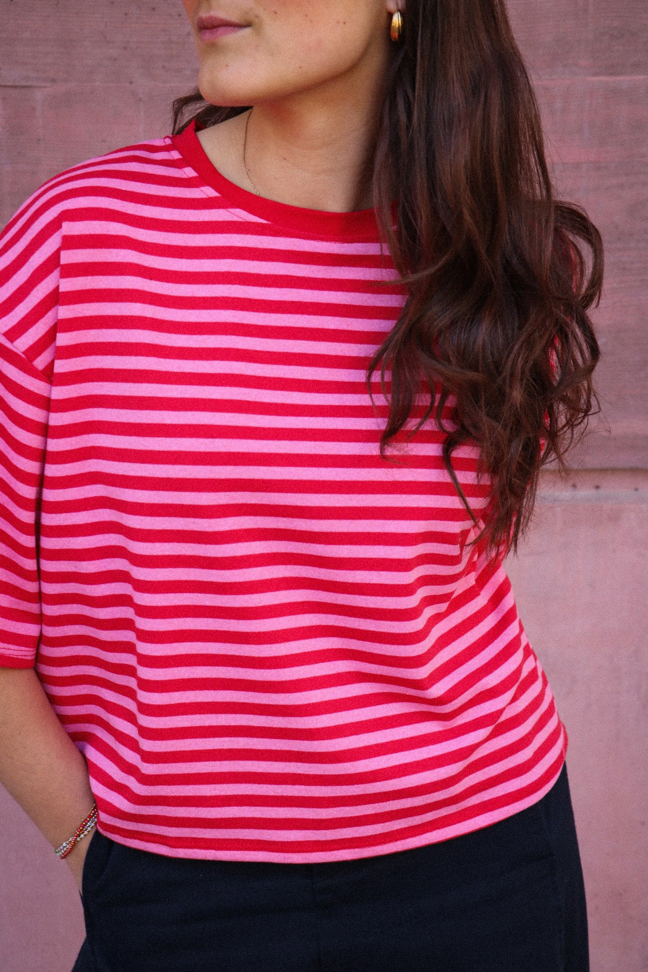 T-shirt oversize à manches courtes et légèrement longues, à la coupe ample, orné de rayures roses et rouge.