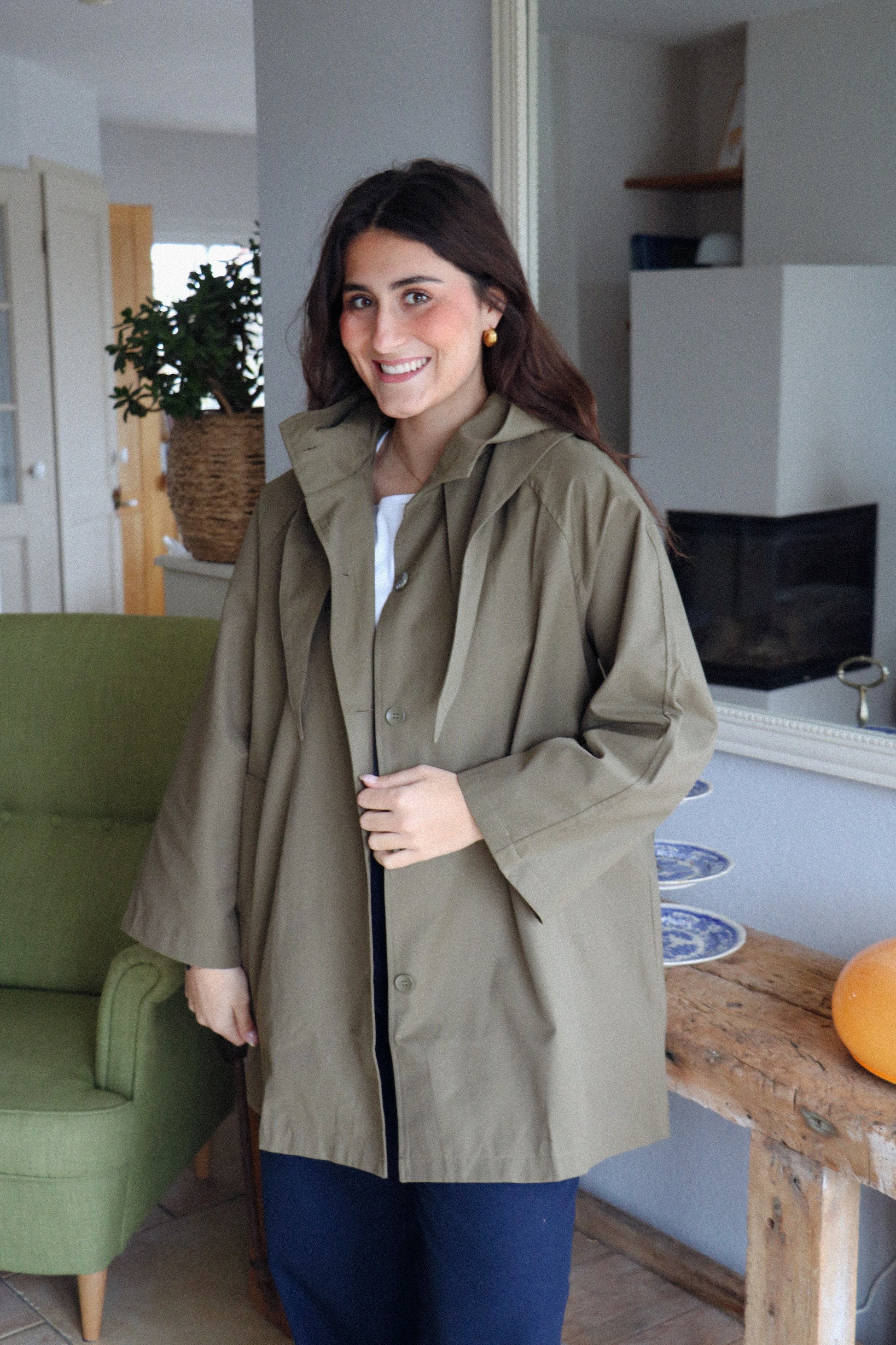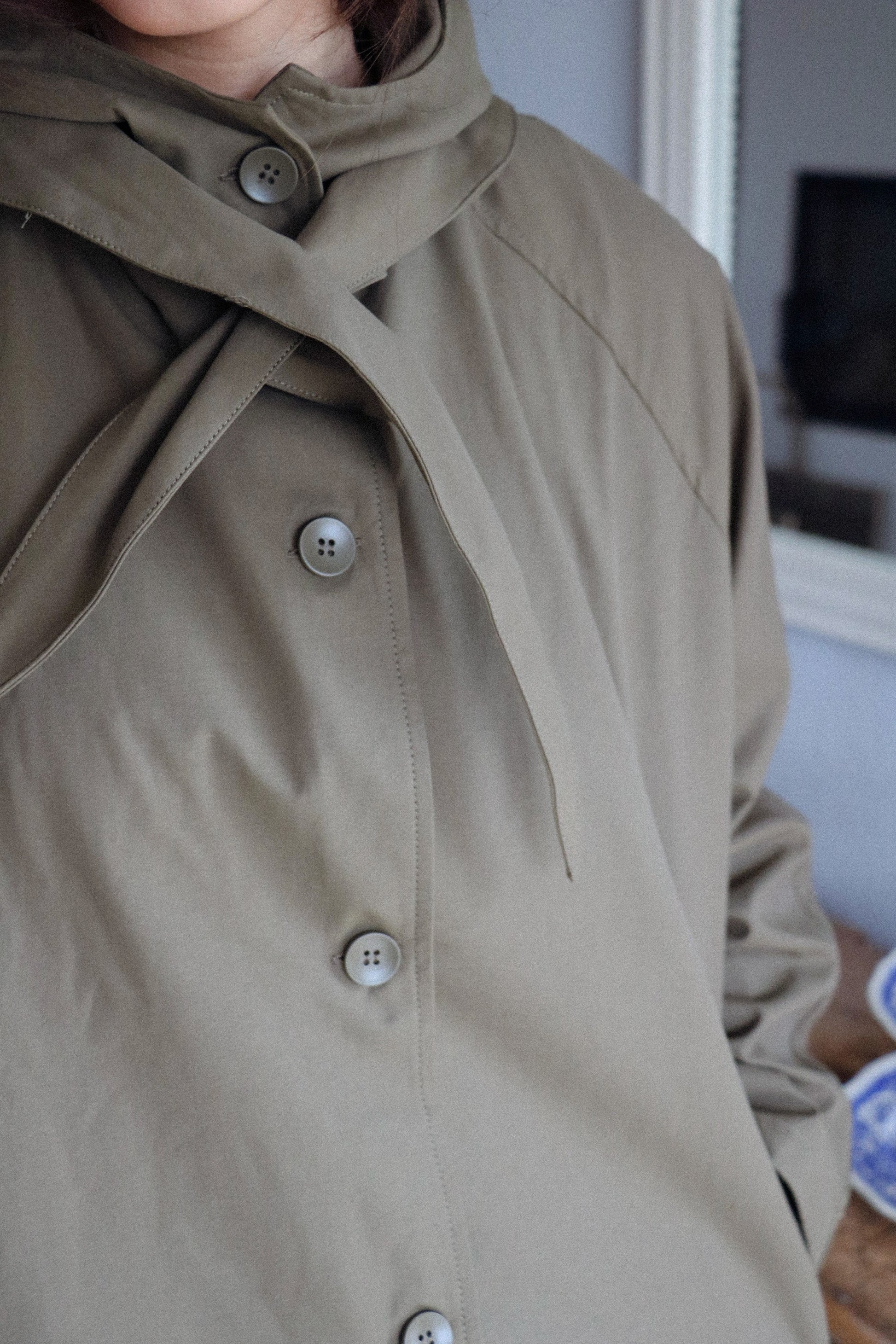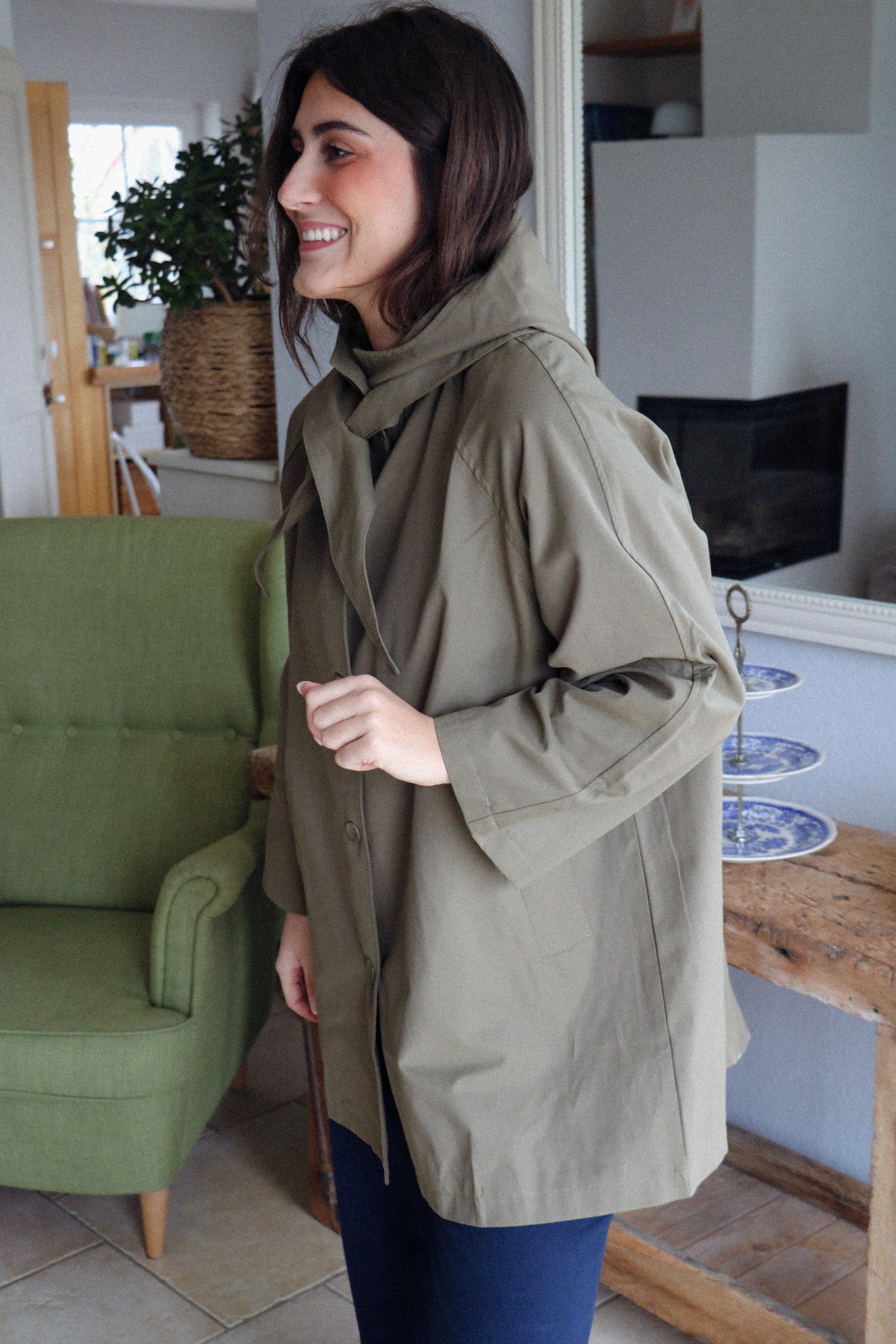Le trench kaki moderne et design. Sa coupe mi-longue et son nœud au col lui donne une allure chic.